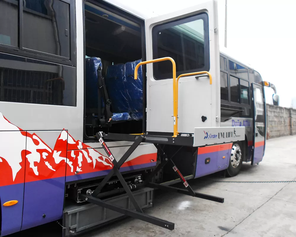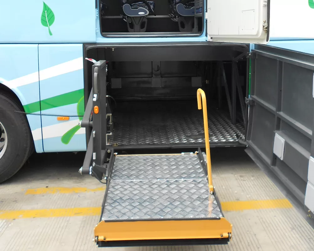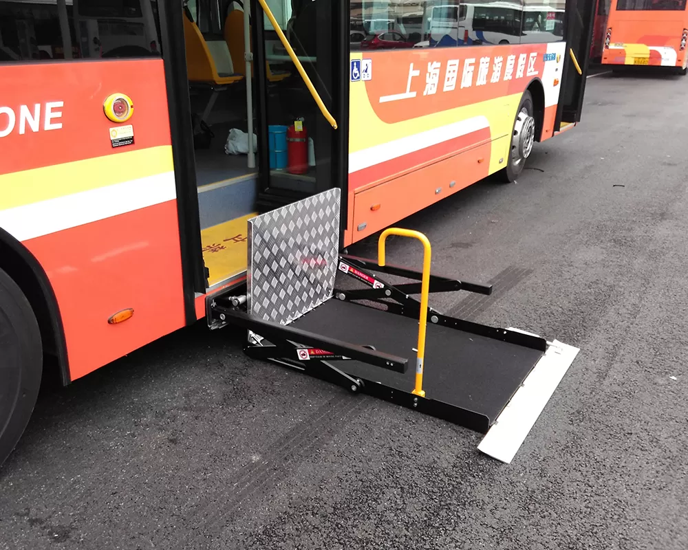 Dopo l'arresto del veicolo, l'apertura della porta, l'ascensore si dispiega dallo stato piegato o nascosto e la piattaforma viene ridotta a terra o l'altezza della piattaforma per facilitare l'ingresso di sedie a rotelle o passeggeri.