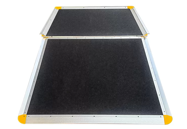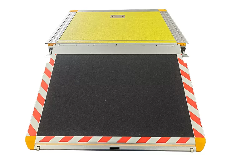 Resistenza allo scivolamento sulla piattaforma:Sia la rampa telescopica che le superfici della rampa di vibrazione utilizzano un nastro antiscivolo nero da 3M, con particelle minerali abrasive che forniscono una superficie antiscivolo stabile.