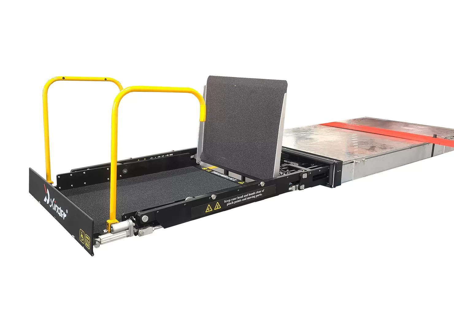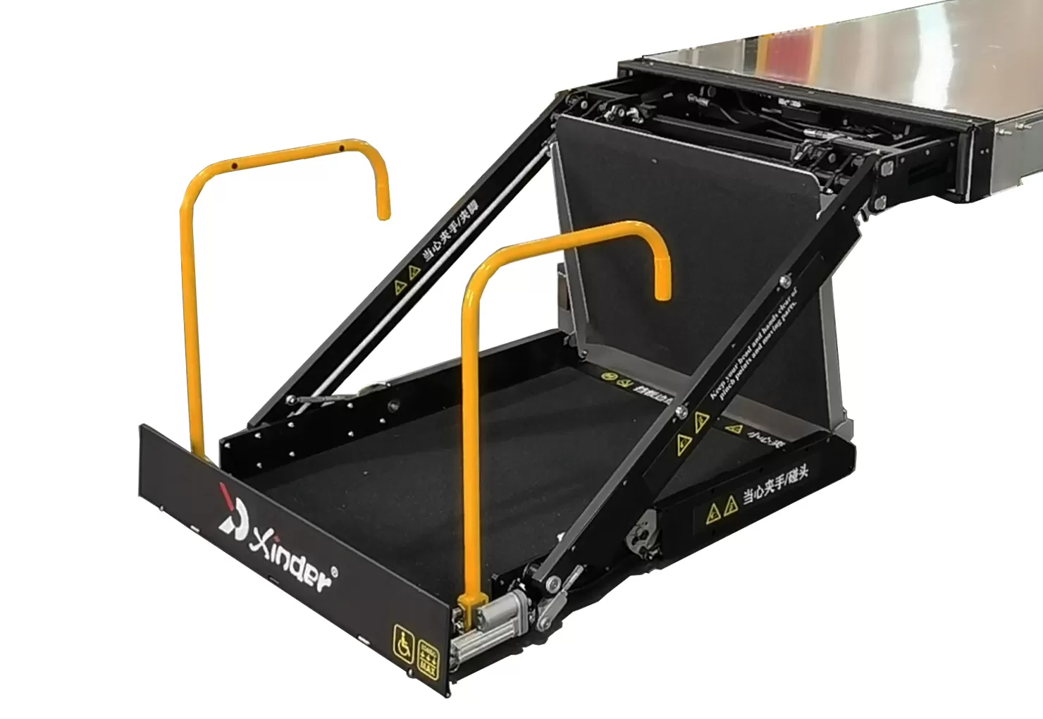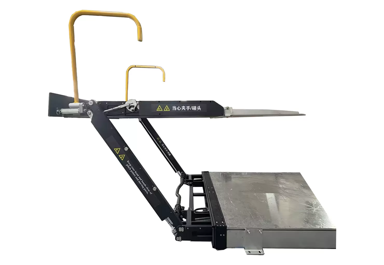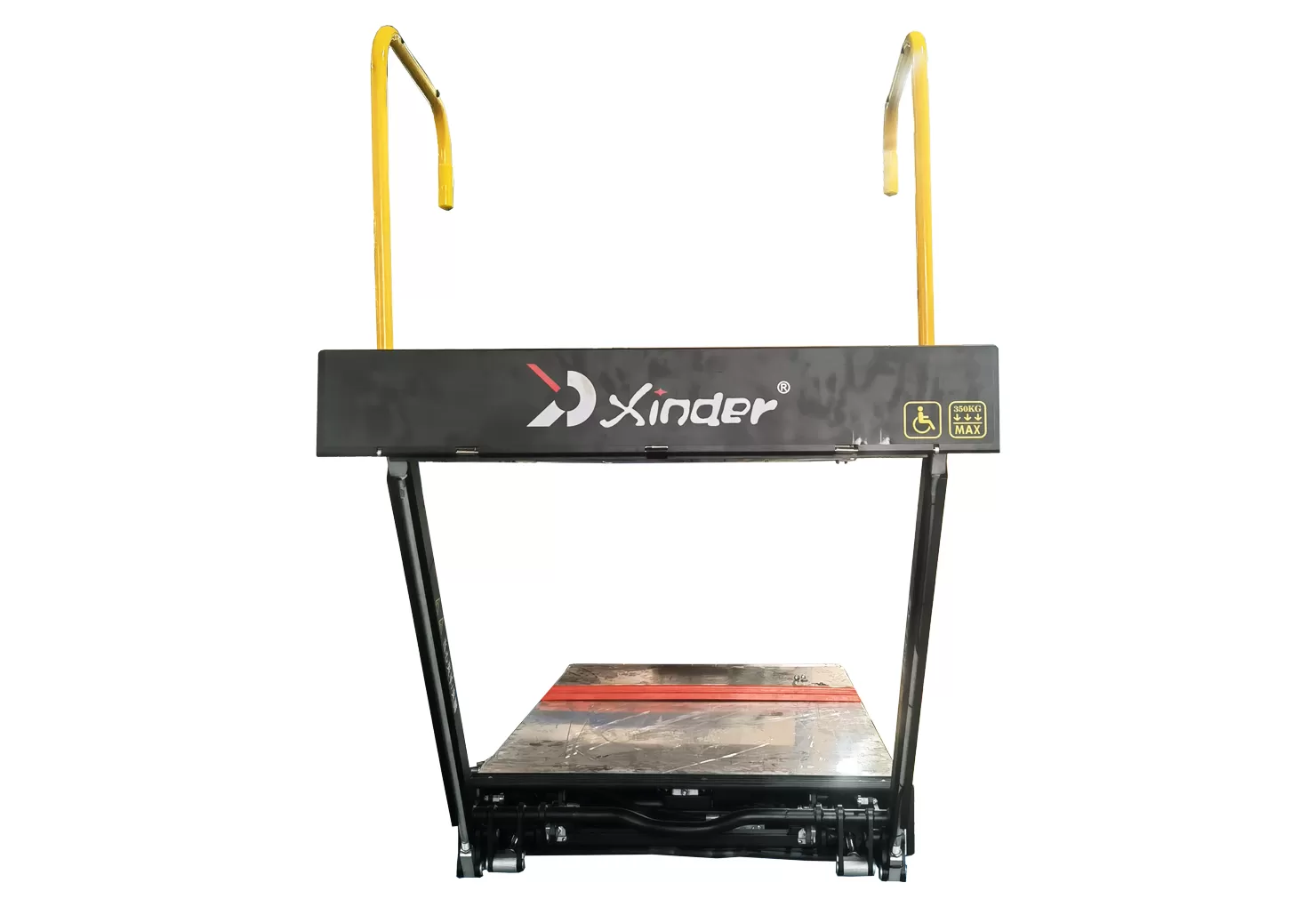 L'ascensore è controllato da un interruttore remoto portatile, con luci e allarmi acustici durante il funzionamento. In caso di mancanza di alimentazione o guasto elettrico, l'ascensore può essere azionato manualmente in caso di emergenza. Presenta una piattaforma antiscivolo ed è dotata di protezioni meccaniche automatiche anteriori e posteriori per garantire la sicurezza degli utenti durante il processo di sollevamento e abbassamento. L'ascensore ha una capacità di carico massima di 350 kg e una altezza di sollevamento massima di 1297mm.