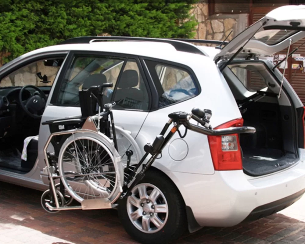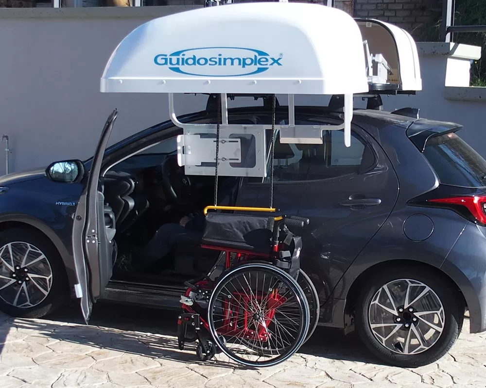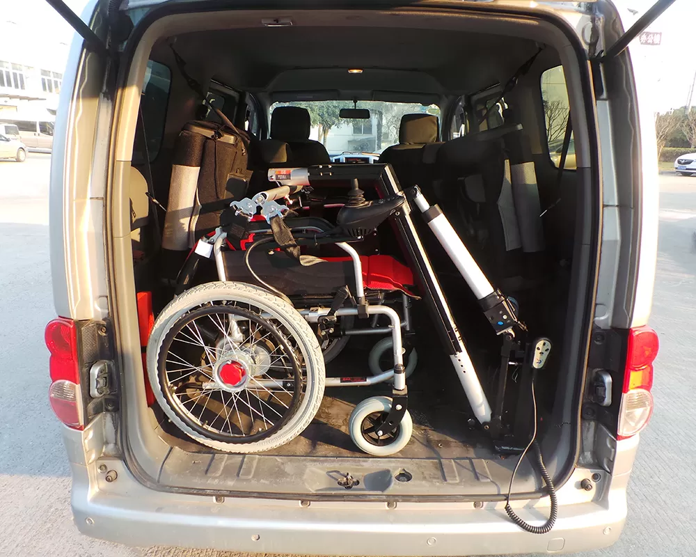Apri il dispositivo nel sedile del conducente, estendi il gancio verso il basso dopo che il tetto è stato aperto, piega la sedia a rotelle e ripara il gancio, quindi controlla il dispositivo per trasferire la sedia a rotelle sul tetto